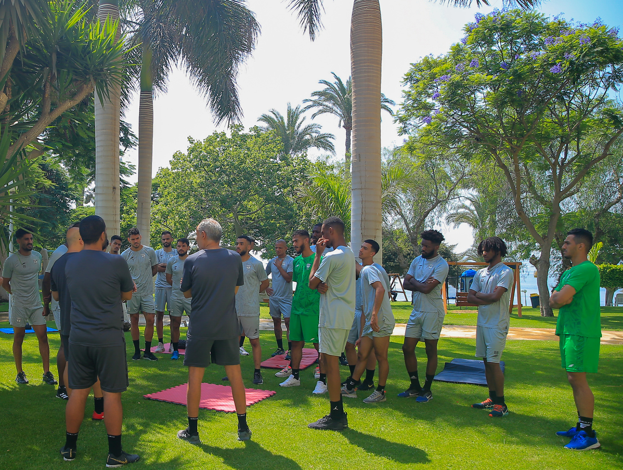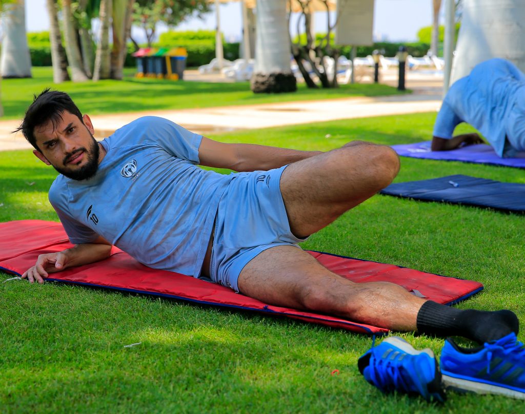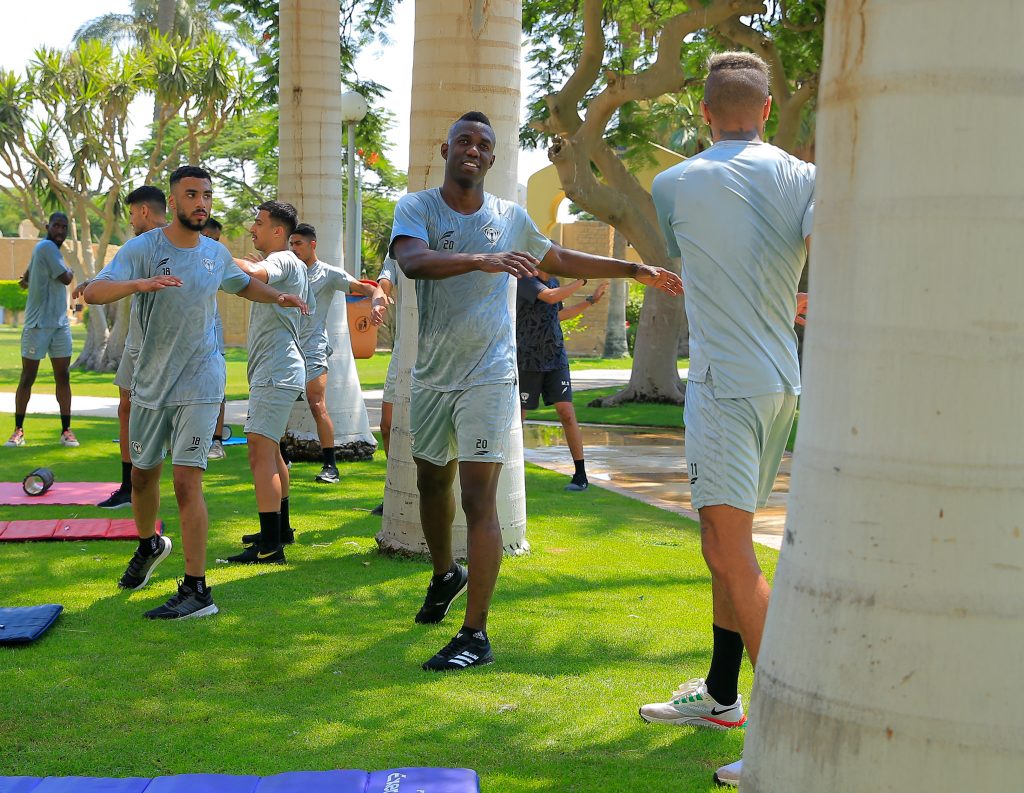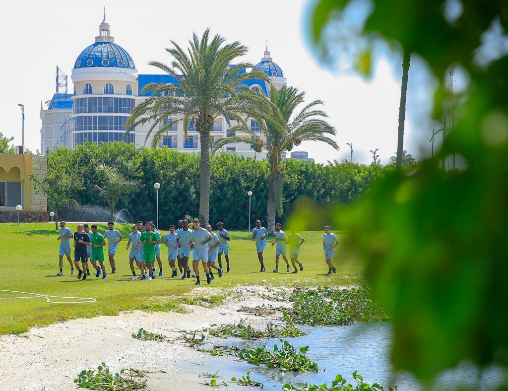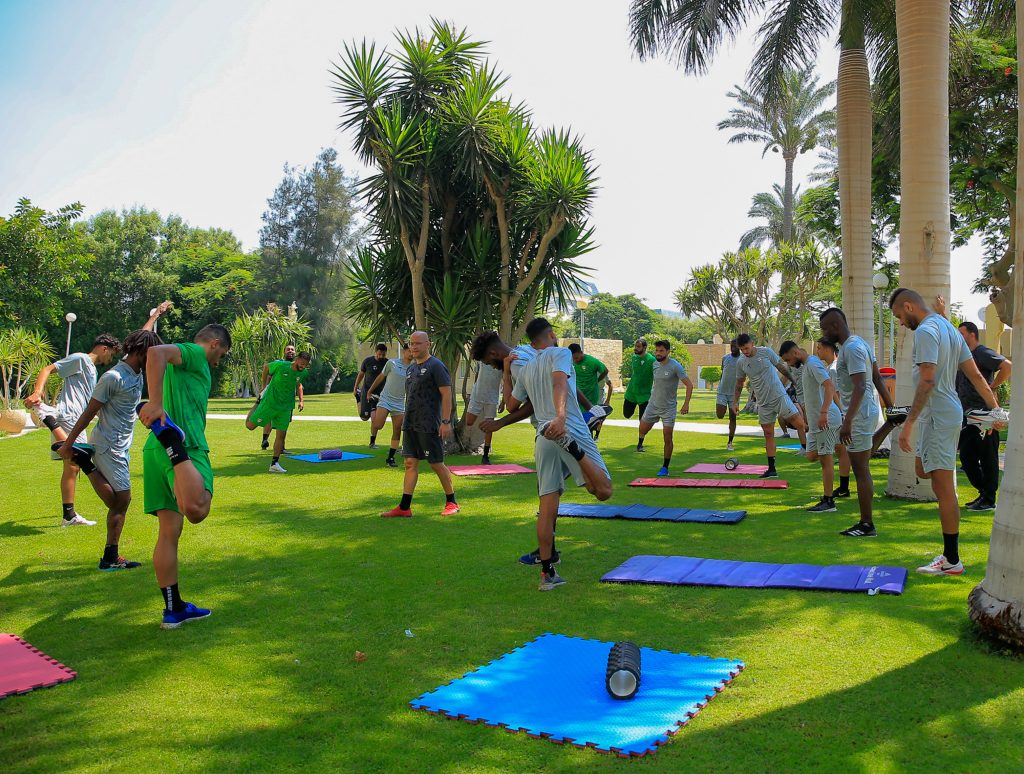 وبدأت التدريبات الصباحية بالجري على الشاطئ لجميع اللاعبين ، بعد ذلك تم تقسيم اللاعبين إلى مجموعتين ، حيث خضع اللاعبين الذين شاركو بصفة أساسية في مباراة القناة الودية لتدريبات استرجاعية ، في حين أدى اللاعبين البدلاء تدريبات تقوية منوعة في صالة اللياقة البدنية .
