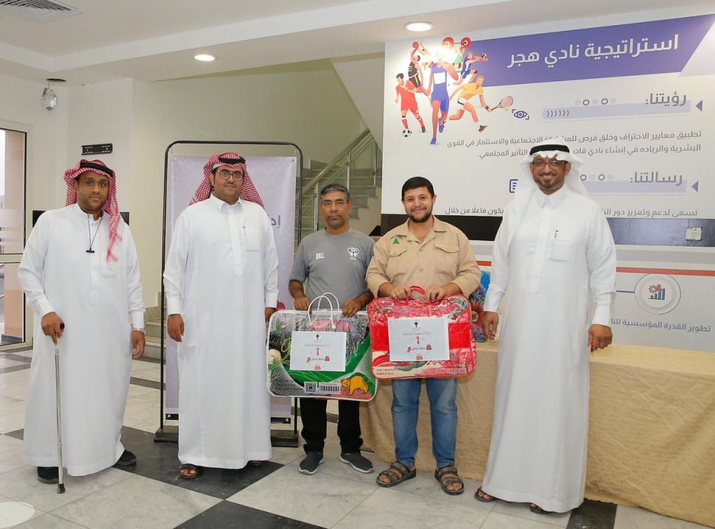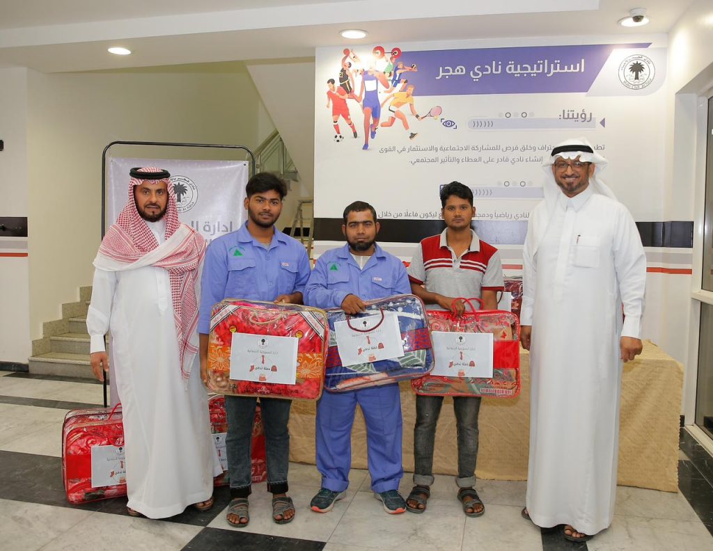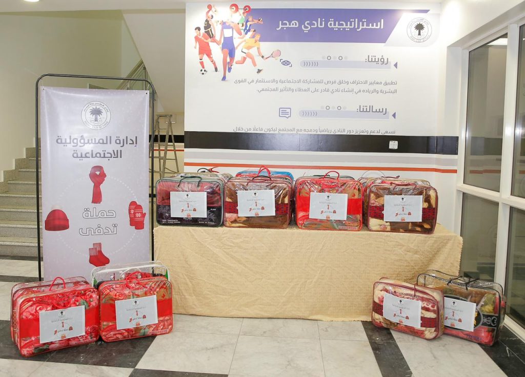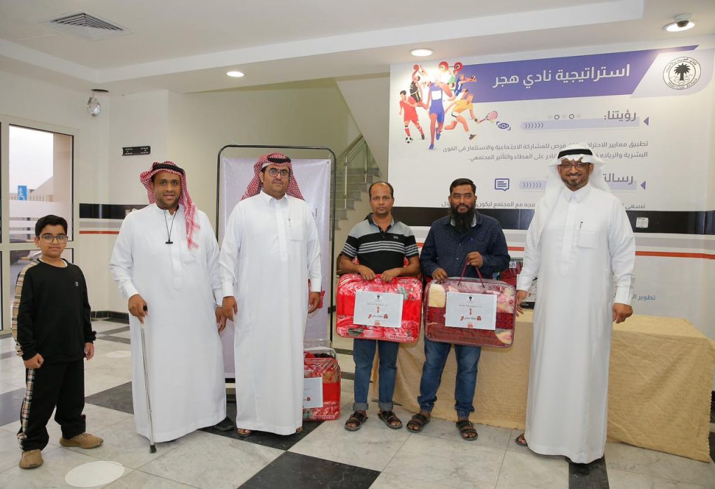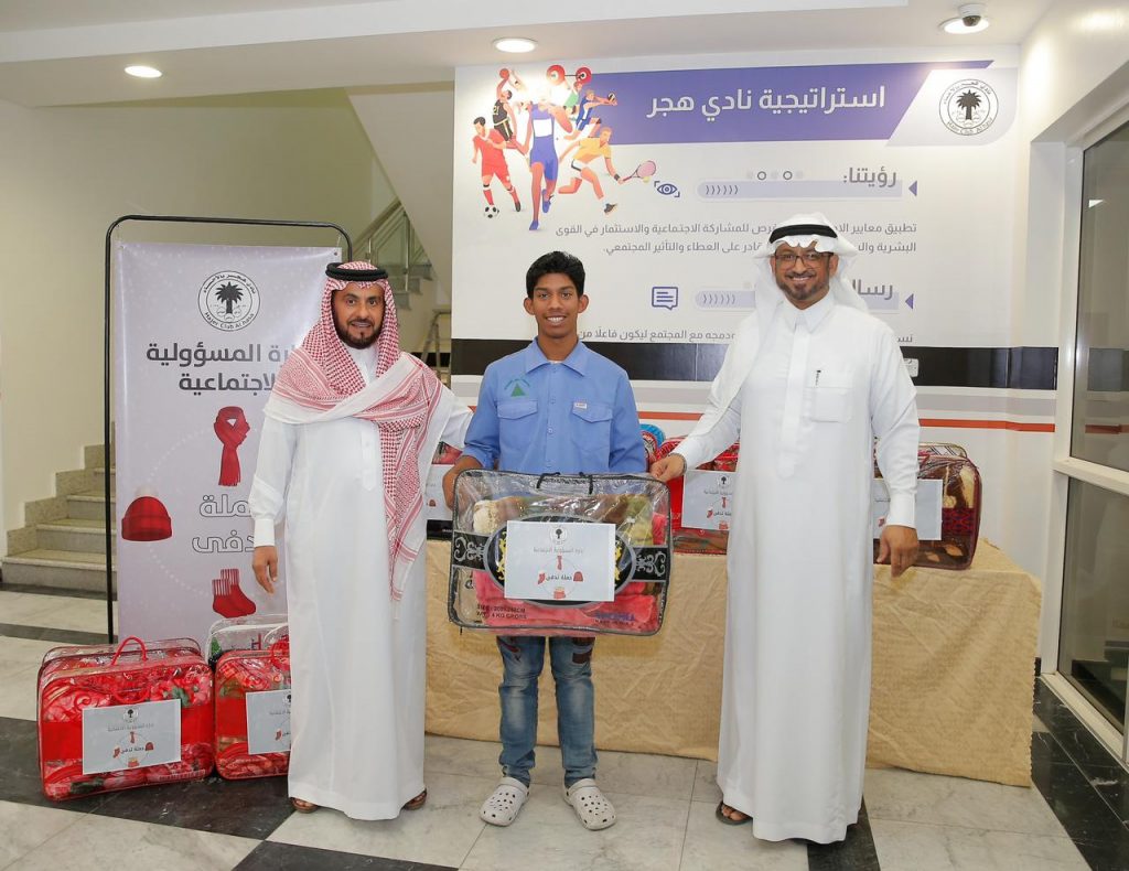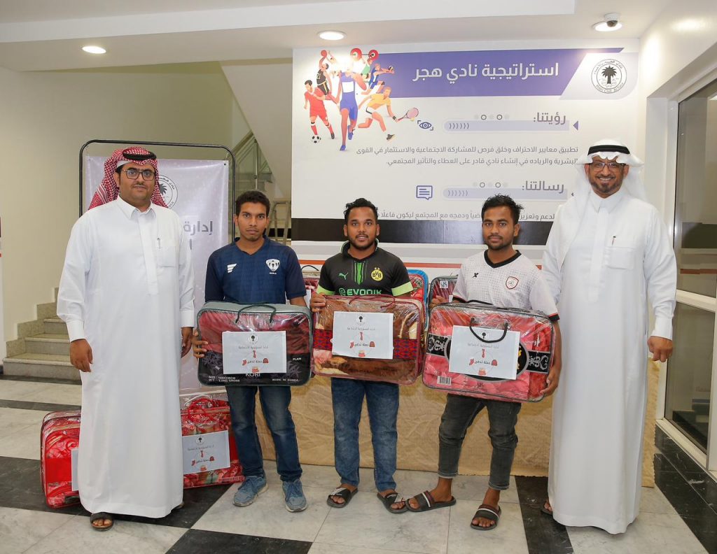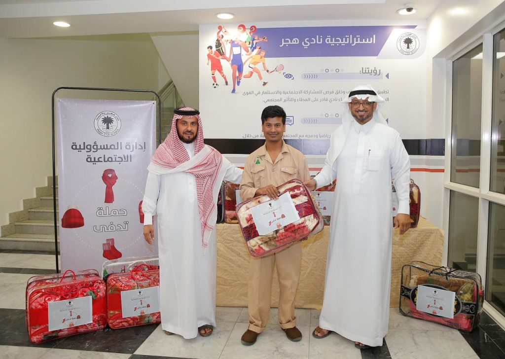 بحضور عضو مجلس إدارة نادي هجر الاستاذ بندر السلطان والرئيس التنفيذي للنادي الاستاذ سامي القنيان أقامت إدارة المسؤولية الاجتماعية بنادي هجر برنامج تدفى وذلك بتوزيع كسوة الشتاء على عمالة النادي .