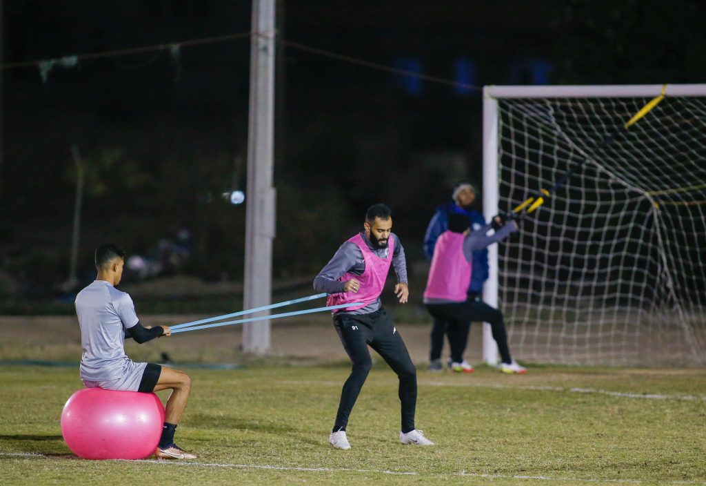 بعد ذلك انطلقت التدريبات بتمارين الاحماء واللياقة ، تبعها تدريبات منوعة للجوانب الدفاعية والهجومية ، كما خضع حراس المرمى لتدريبات خاصة مع مدرب الحراس ، واختتمت التدريبات بمناورة كروية .