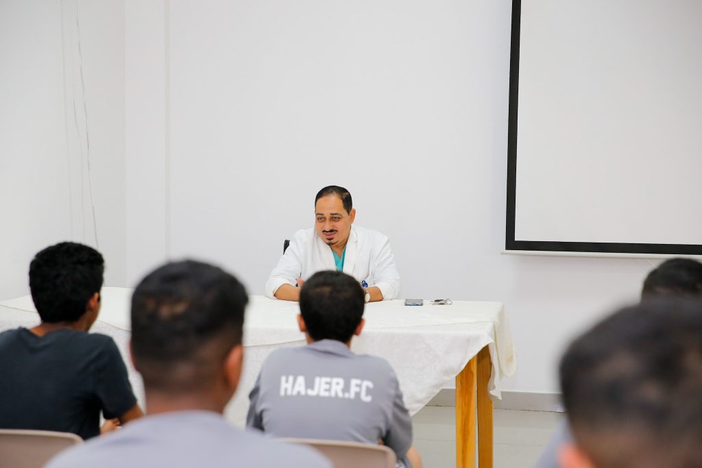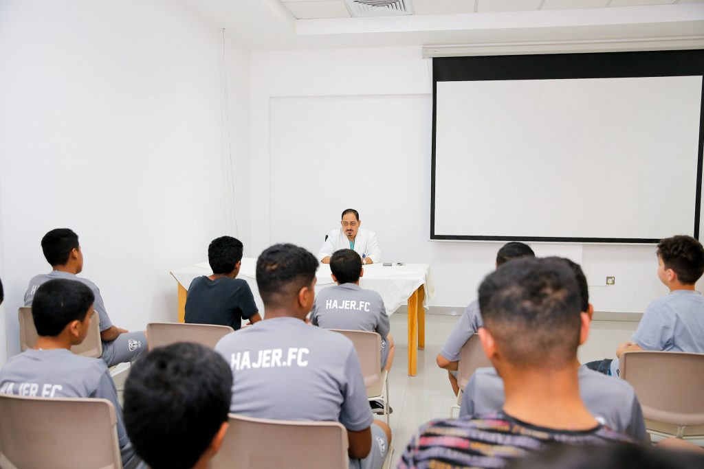 نظمت إدارة المسؤولية الاجتماعية بنادي هجر حملة صحية عن إصابات الملاعب قدمها أخصائي العلاج الطبيعي الدكتور محمد كامل للاعبي كرة اليد بالنادي . ويهدف البرنامج إلى معرفة أخطر الإصابات التي يتعرض لها اللاعبين في كل لعبة وكيفية إسعاف هذه الإصابة .