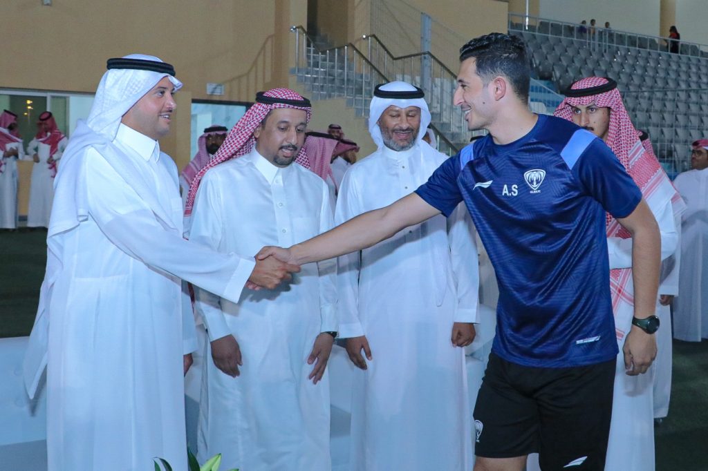 واطلع سموّه على مرافق النادي، إضافة إلى حضور سموّه جزء من تدريبات الفريق الأول لكرة القدم ، مستمعاً سموّه إلى ابرز التحديات التي تواجه الفريق في دوري يلو لكرة القدم .