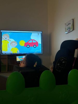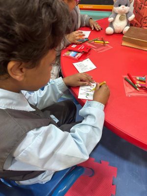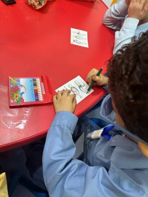 كما تم توزيع صور للإشارة الضوئية على أطفال المركز لتلوينها وتحديد دلالات كل لون .